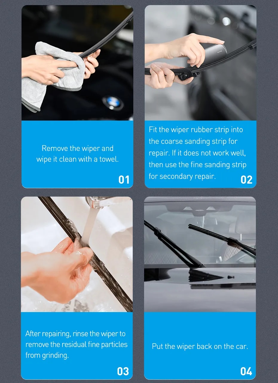 1. remova o limpador e limpe com uma toalha.2. ajuste a tira de borracha do limpador na tira de lixamento grosseira para o reparo. Se não funcionar bem, use a tira de lixamento fina para reparo secundário.3. após a reparação, lave o limpador para remover as partículas finas residuais da moagem.4. coloque o limpador de volta no carro.