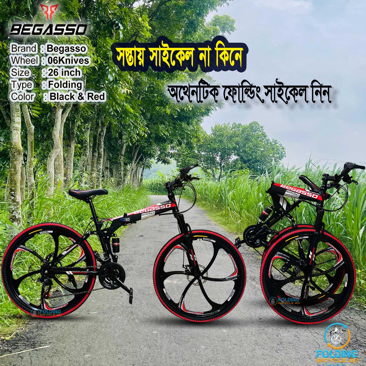 Begasso Folding Bicycle | 26 Inch | Alloy Wheel | 6 Nives | Double Suspension | Shimano Gear & Brake | Double Disk Brake | Chili-Red Color