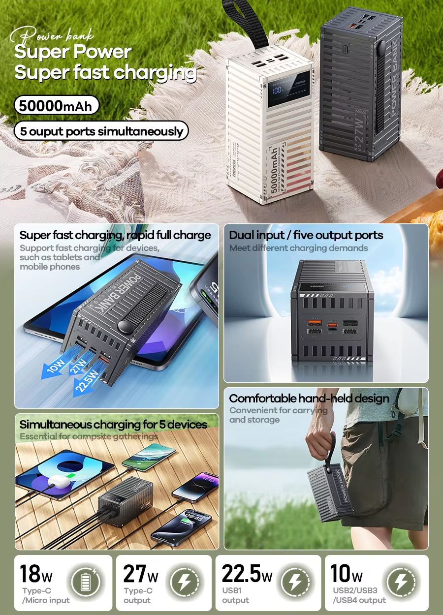 - 4 outputs, TYPE-C output fast charge 27W, USB-A1 output super fast charge 22.5W