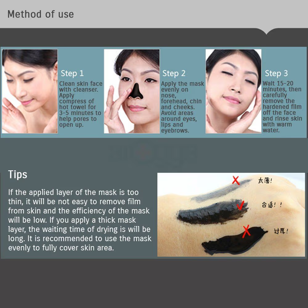 Easy removal of black spots for your beauty! Removes black spots. Deeply cleanses skin. Cleans pores. Affects gently. Effective removal of black spots. Use the correct method to use. Effective removal of black spots. Get rid of the imperfections on your beautiful face! Get rid of black spots on your skin. Can also help to get rid of blackheads. Use different approach for different degrees of impurity of skin pores. Easy level of imperfections. Before using the mask, apply a hot towel for 2-3 minutes to face to help pores to open up. It is recommended to use serum for pores reducing after the procedure.