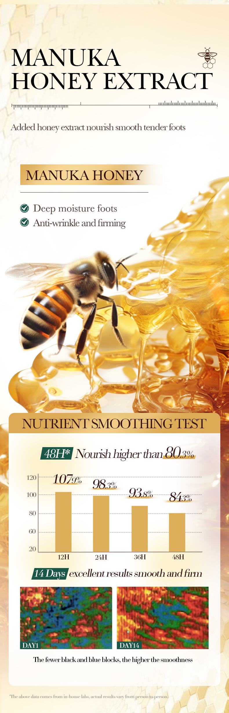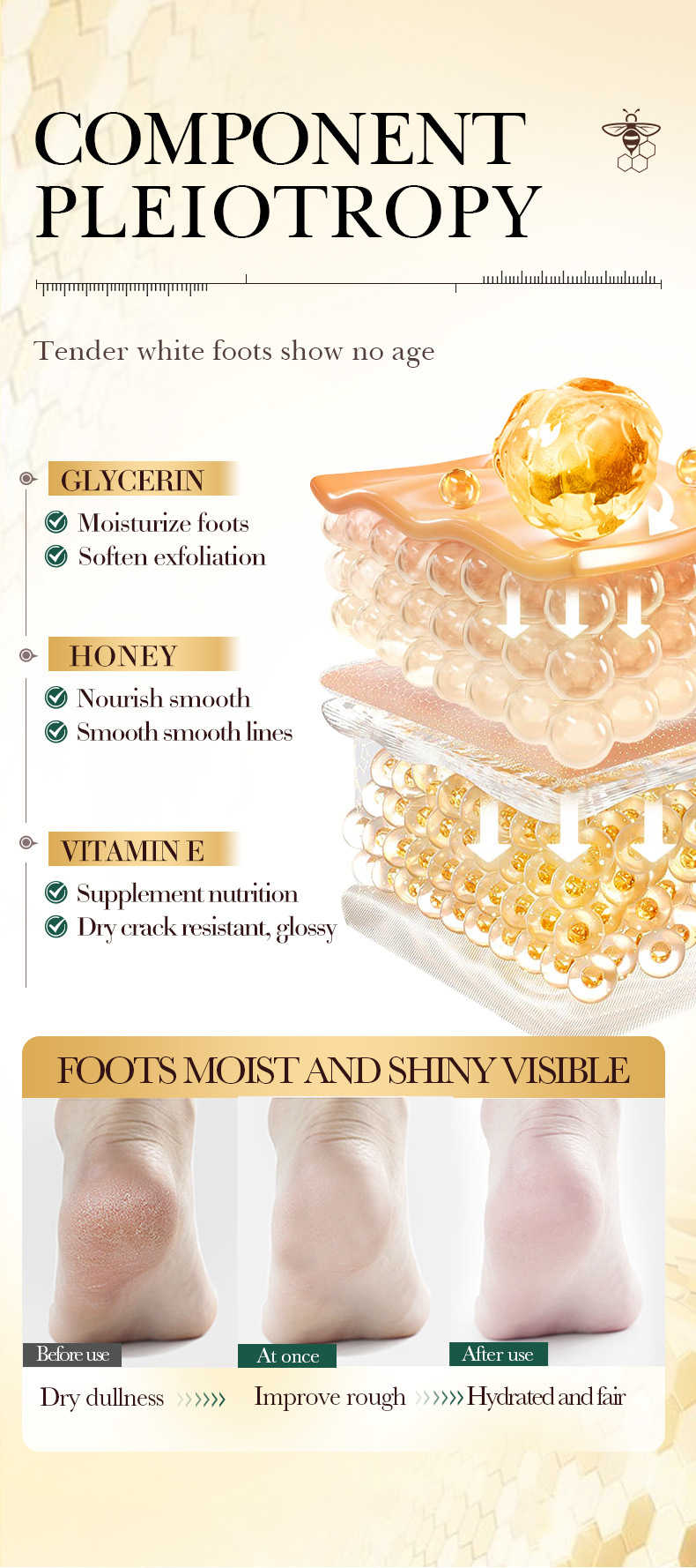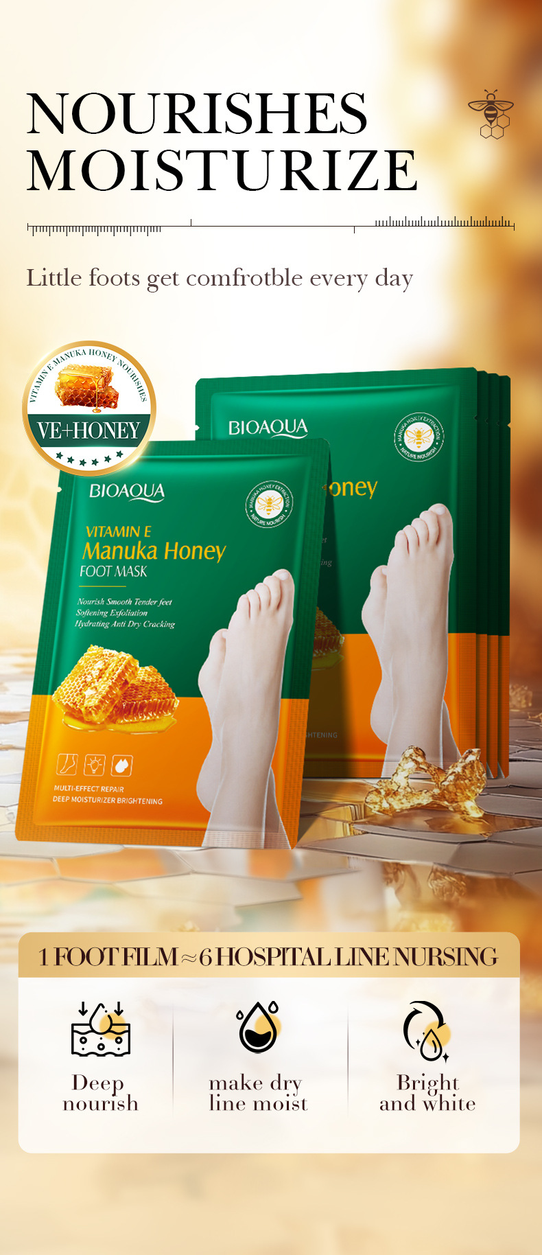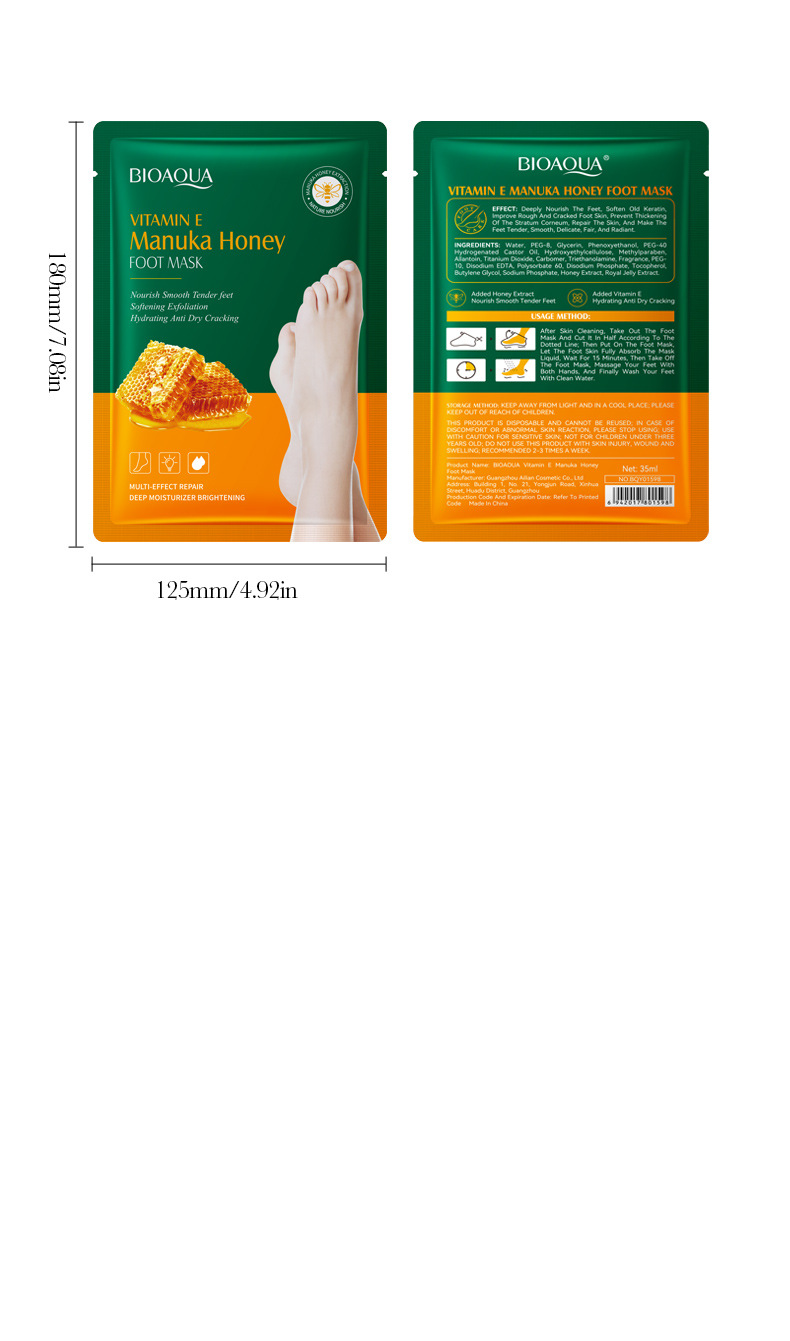 BIOAQUA Vitamin E Manuka Honey Foot Mask: Nourishes and smooths for soft, tender feet. Softens and exfoliates. Hydrates and helps prevent dryness and cracking. Deeply nourishes the feet, softens old keratin, improves rough and cracked skin, prevents thickening of the stratum corneum, repairs the skin, and leaves the feet tender, smooth, delicate, fair, and radiant.