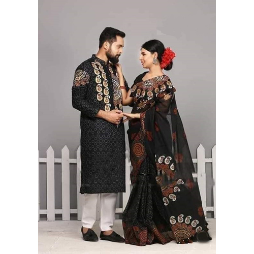 Black Hand Print Half Silk Saree and Dupaiyan Panjabi couple Dress for Men and women