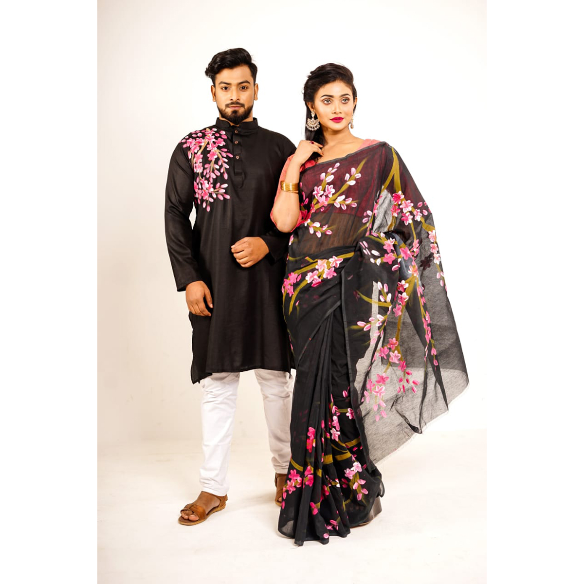 Black Hand Print Half Silk Saree and Dupaiyan Panjabi couple Dress for Men and women