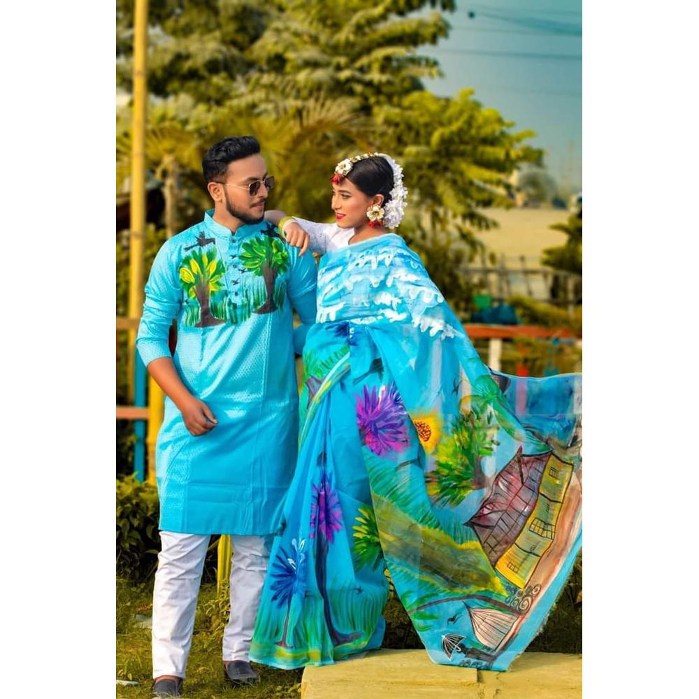 Blue Hand Print Half Silk Saree and Dupaiyan Panjabi couple Dress for Men and women