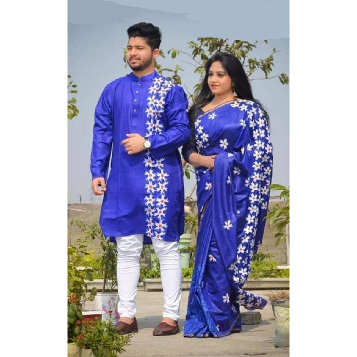 Blue Hand Print Half Silk Saree and Dupaiyan Panjabi couple Dress for Men and women