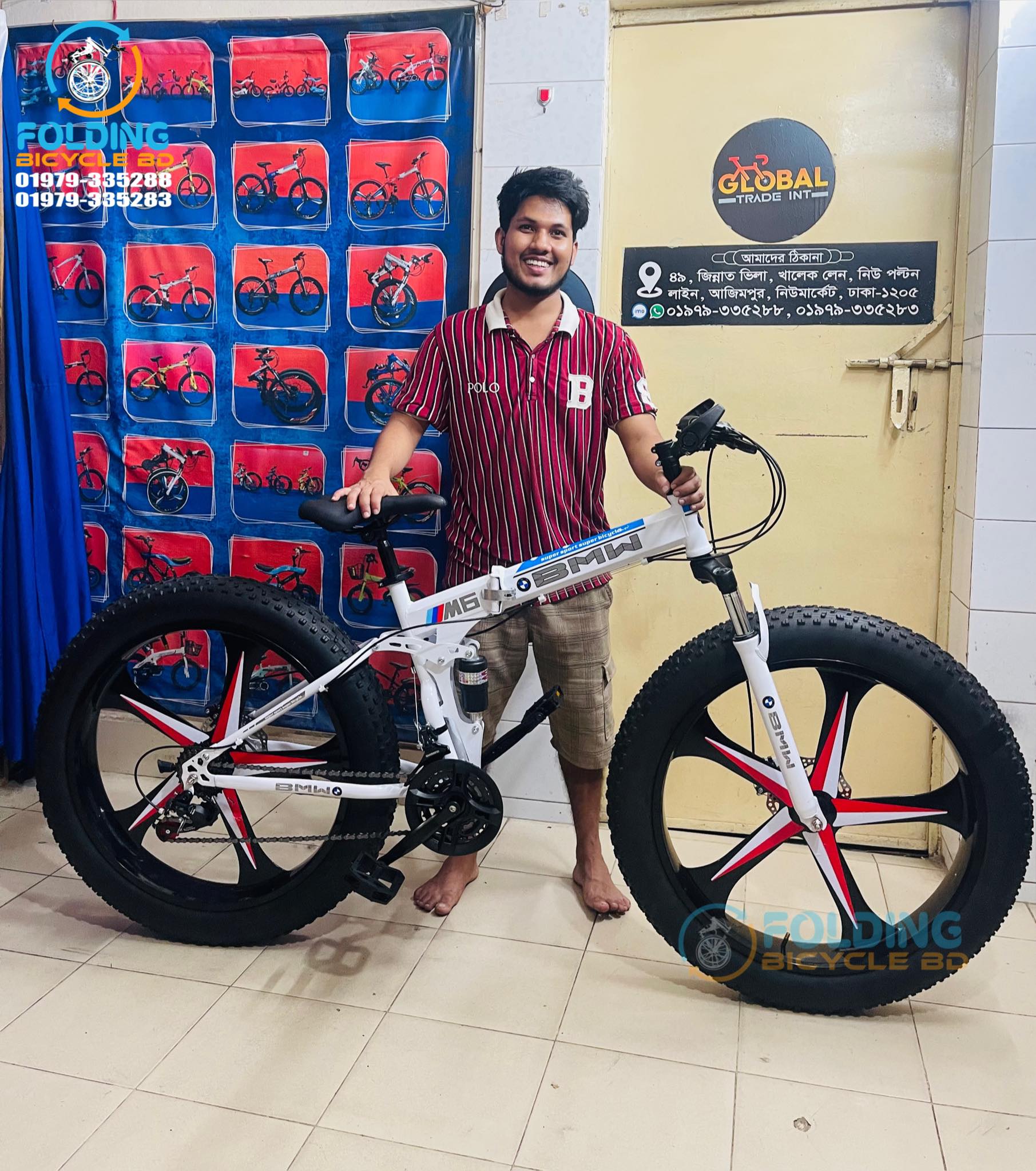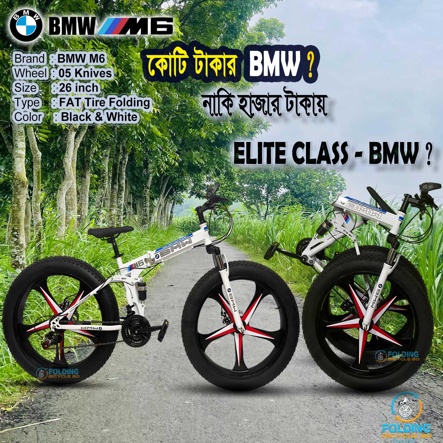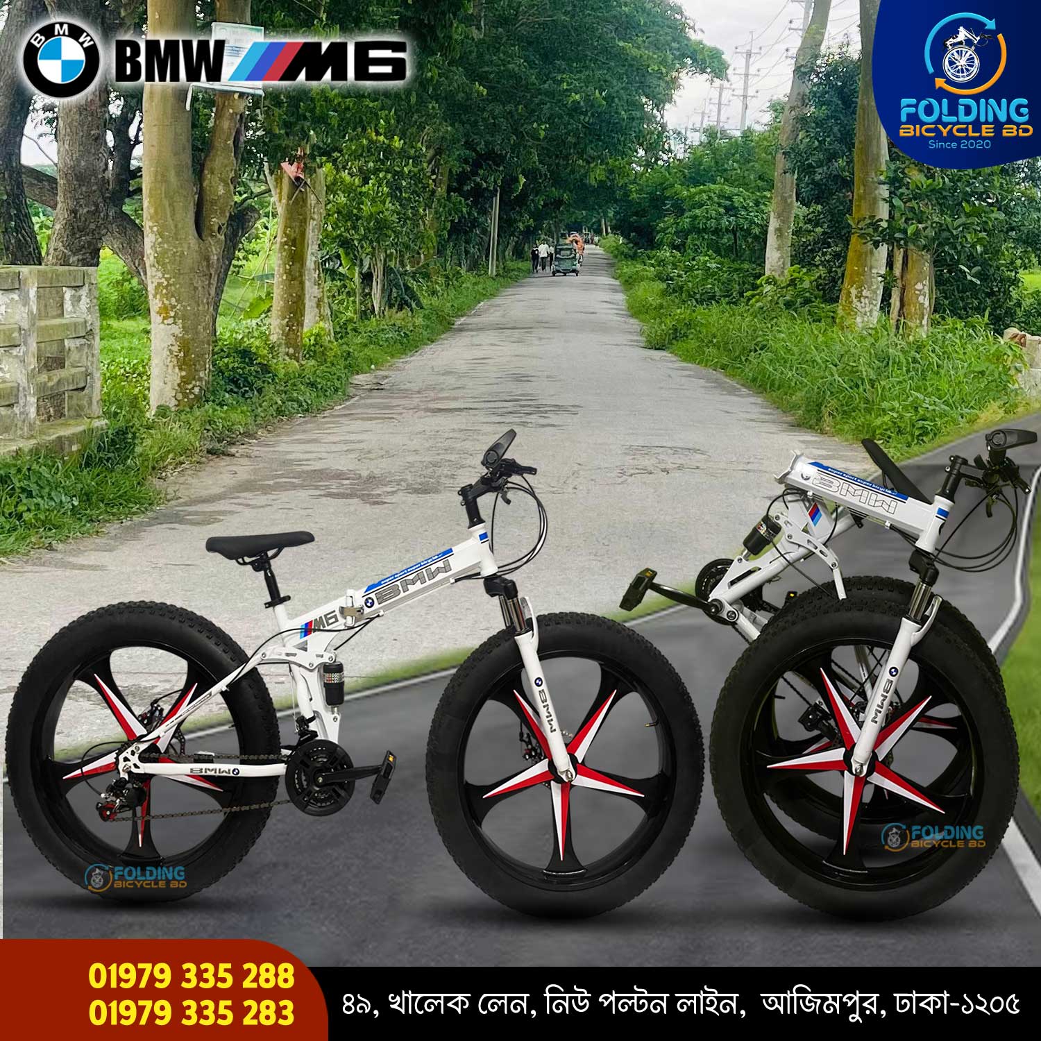 BMW (M6) Fat Tire Folding Bicycle | 26 Inch | Alloy Wheel | 05 Nives | Double Suspension | Shimano Gear & Brake | Double Disk Brake | White & Black