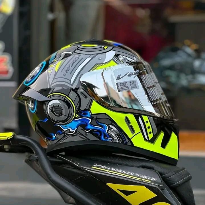 Product details of Vega Bolt superhero Glossy Black green full face helmet with dual certification.