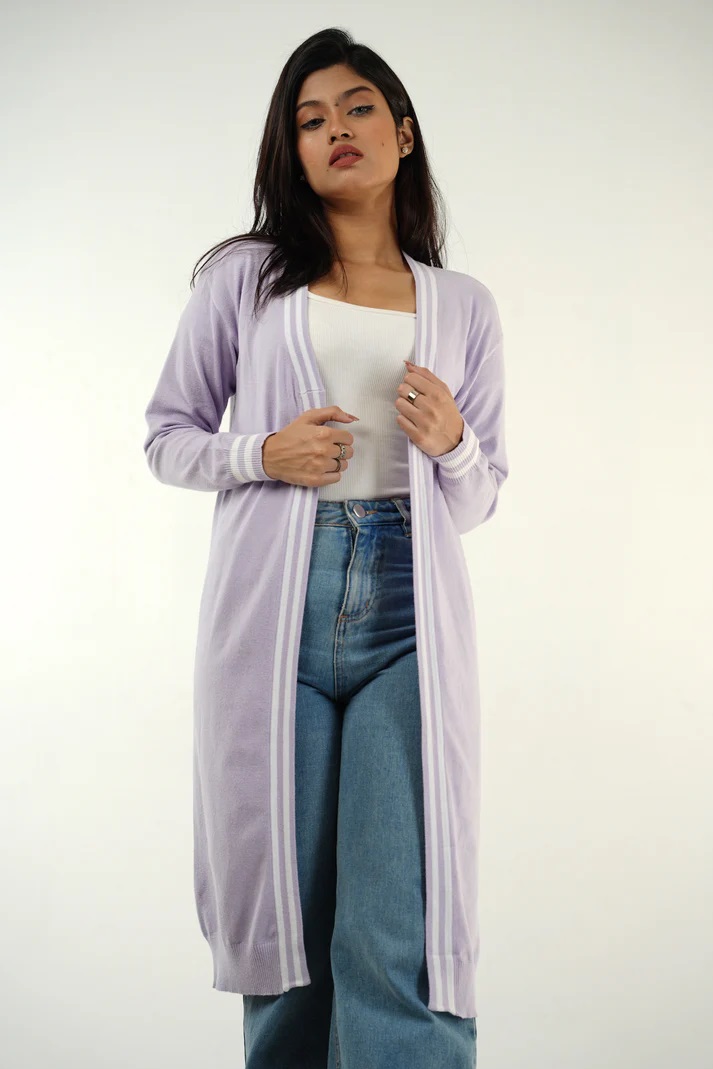 Cardigan. The lilac hue combined with the crispness of the white stripes