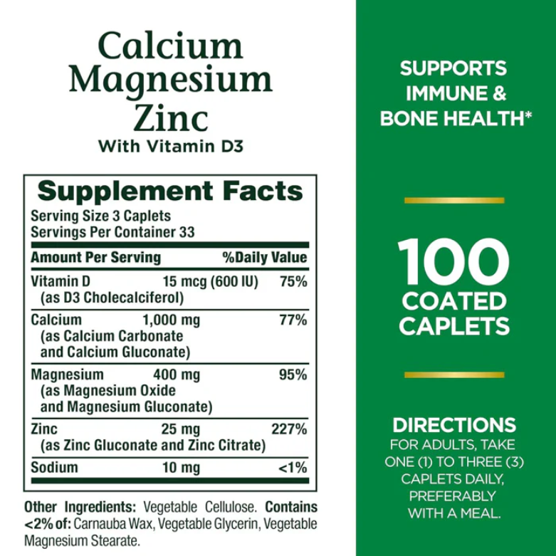 Nature’s Bounty Calcium Magnesium Zinc with Vitamin D3 – 100 Coated Caplets একটি পুষ্টিকর সাপ্লিমেন্ট, যা হাড়ের স্বাস্থ্য, পেশী কার্যকারিতা, স্নায়ু সিস্টেম এবং রোগ প্রতিরোধ ক্ষমতা সমর্থনে সহায়তা করে।