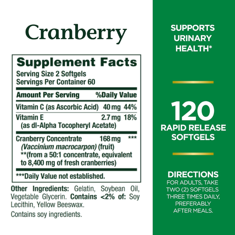 Nature’s Bounty Cranberry 4200mg with Vitamin C – 120 Softgels একটি হার্বাল সাপ্লিমেন্ট যা মূত্রনালী ও রোগ প্রতিরোধ ক্ষমতা সমর্থনে সহায়তা করে।