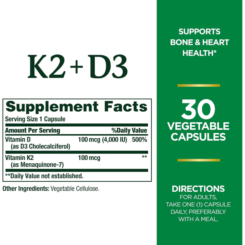 Nature’s Bounty K2 + D3 হলো একটি খাদ্য সম্পূরক যা ভিটামিন D3 এবং ভিটামিন K2 এর সমন্বয়ে গঠিত। ভিটামিন D3 শরীরের ইমিউন সিস্টেমকে শক্তিশালী করে এবং হাড়, দাঁত ও পেশীর স্বাস্থ্যে সহায়তা করে। ভিটামিন K2 ক্যালসিয়ামের সঠিক শোষণ ও বিতরণে সহায়তা করে, যা হাড়ের দৃঢ়তা বজায় রাখতে এবং ধমনী স্বাস্থ্য রক্ষায় গুরুত্বপূর্ণ ভূমিকা পালন করে।