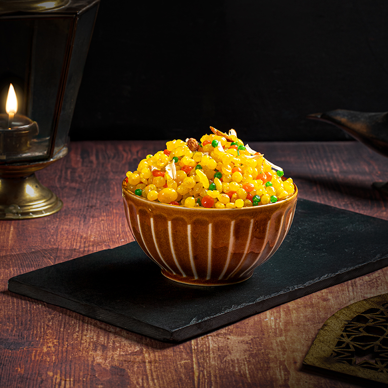 Bundia is a crispy Indian snack made from spiced gram flour batter, deep-fried into crunchy, noodle-like strips.