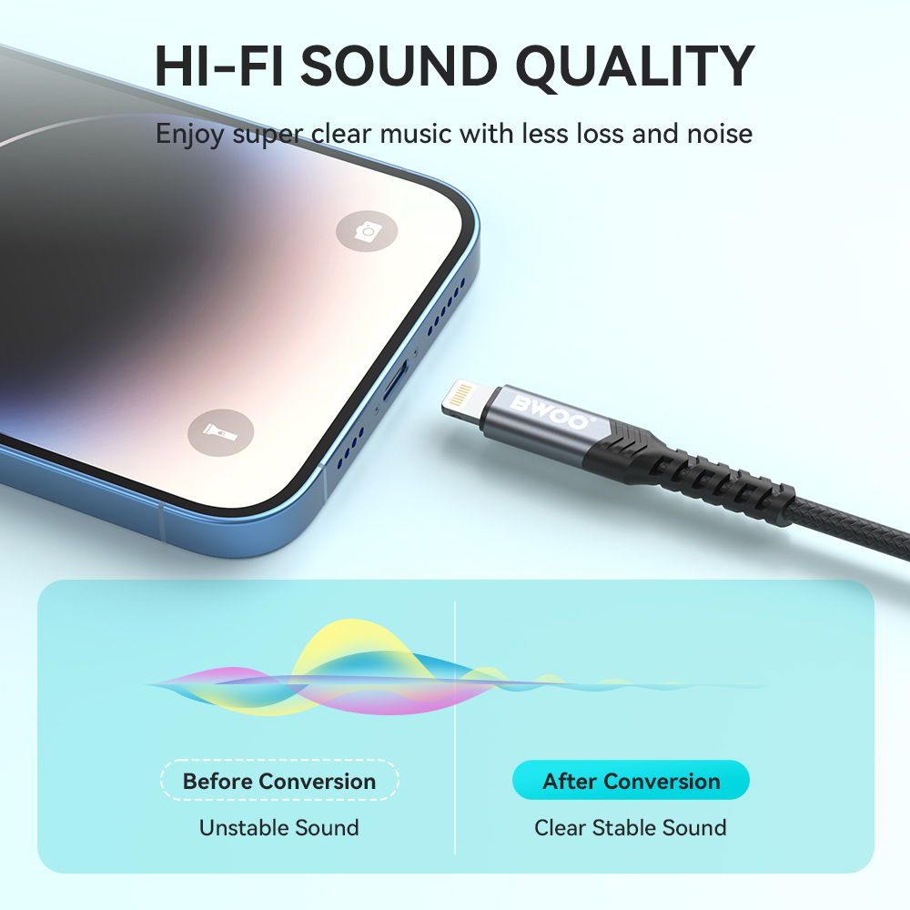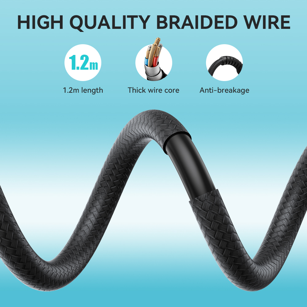 With a powerful digital audio decoding processor, it can efficiently reduce sound detail attenuation during transmission while also precisely restoring music details, resulting in a high-resolution audio listening experience. Built-in tinned copper cores with good conductivity and low resistance effectively reduce electromagnetic interference. Nylon braided cable features excellent resistance to daily scratches and abrasion for better durability.