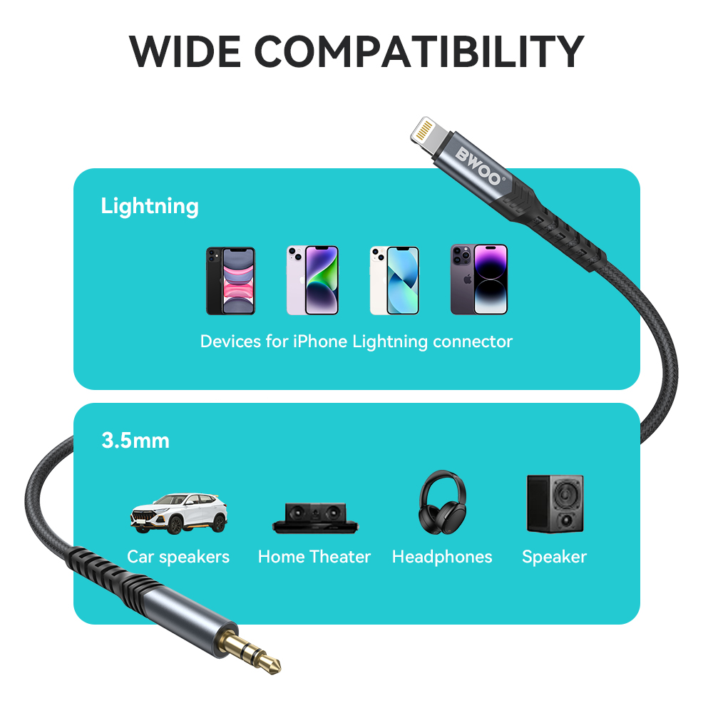 Gauge: PVC black OD3.15, 11/0.08*3C, Braided OD 3.5 Black Armor Wire. This 3.5mm to lightning aux cable that is compatible with all Lightning-enabled devices including iPhone, iPad, Macbook and others. Use this Aux cable to connect any lightning devices to home stereos, car stereo, speakers, headphones, and more for sweet soundtracks to light up your inner drive whether on a long road trip or at home.