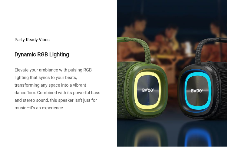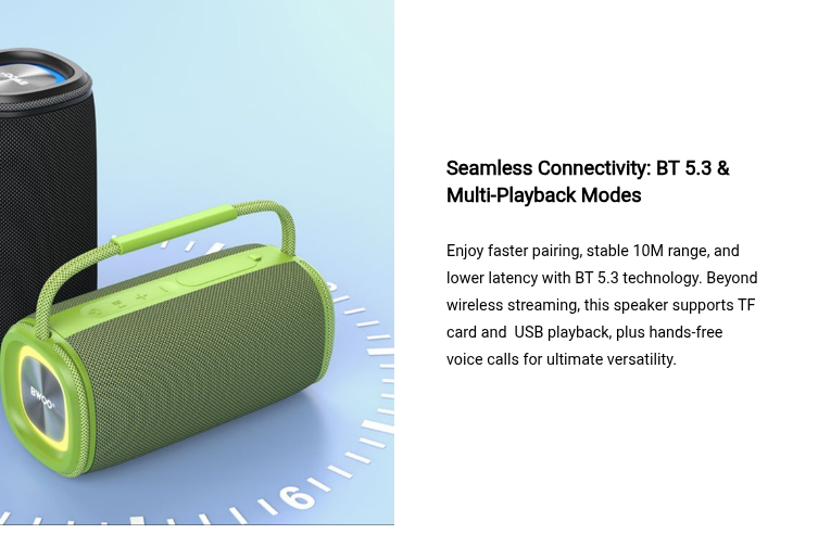 BO-BS91 dual-speaker wireless speaker, engineered for stereo surround sound that brings music to life. The advanced dual-driver setup delivers crisp mid- and high-frequency tones, while the bass diaphragm pumps out deep, rich lows for shocking bass performance. With a 95dB SNR and 150Hz-18kHz frequency response, every note is balanced and distortion-free.
