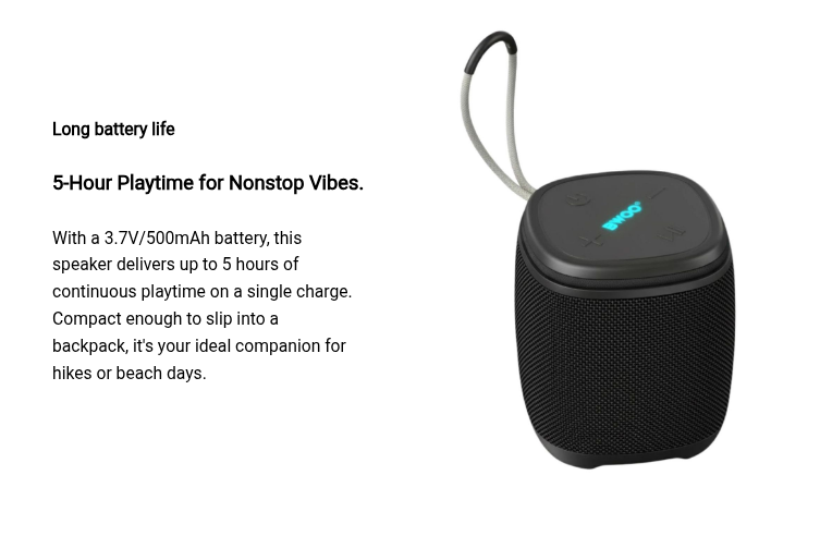 Equipped with a 5W speaker and a 150Hz–18kHz frequency response, it punches above its weight, producing crisp highs, detailed mids, and punchy lows. Perfect for outdoor adventures or impromptu parties, its small size hides a bold sonic personality that fills room with immersive sound.