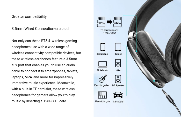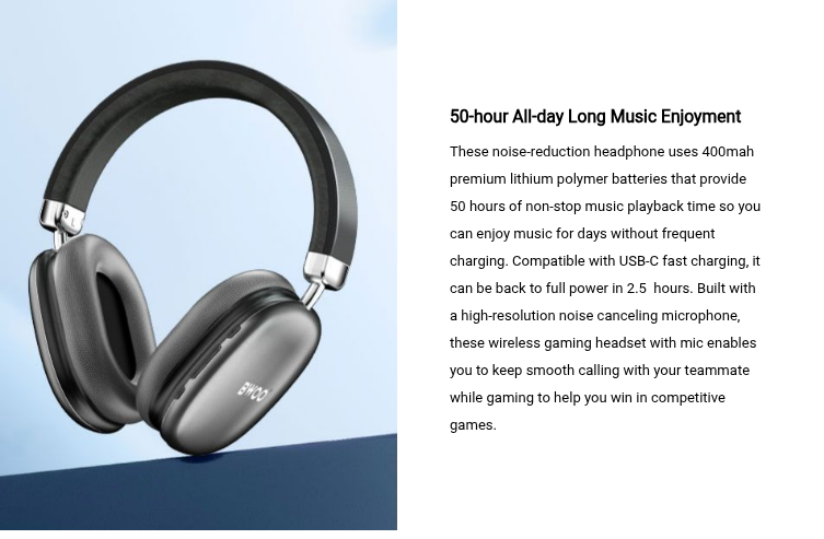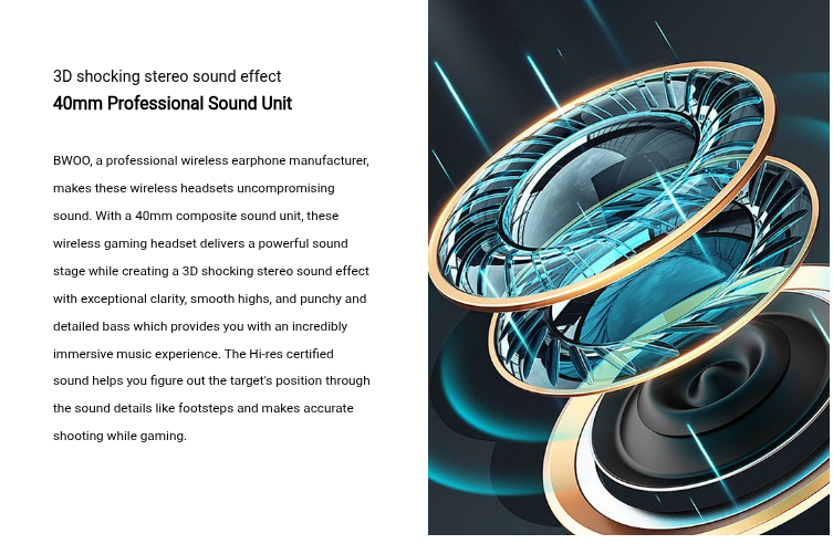 BWOO wireless gaming headset is designed for unparalleled gaming performance. With the adoption of BT5.4 wireless connectivity tech, this over-ear gaming headset can quickly connect with the supported device in a radius of more than 10 meters and always keep a stable and reliable connection even in a complicated data environment. Combining the cutting-edge latency reduction tech, it delivers a lag-free audio experience and keeps audio and video sync, which immerses you in the sound whether you are gaming watching video, or listening to music.