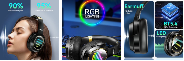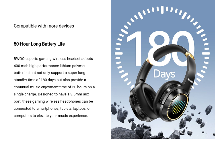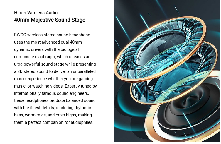 BWOO wireless headset BT V5.4 boasts the upgraded BT5.4 technology that delivers seamless and stable connection with minimal latency so that you can enjoy lag-free music, clear phone calls, and fast pairing with your devices. Whether you're watching live streaming videos, or playing esports games, it can keep a stable and reliable connection. Additionally, BT5.4 advanced wireless connectivity tech promises an extended wireless range, which enables you to move freely while enjoying music without losing connection, adding to the convenience of your daily use.