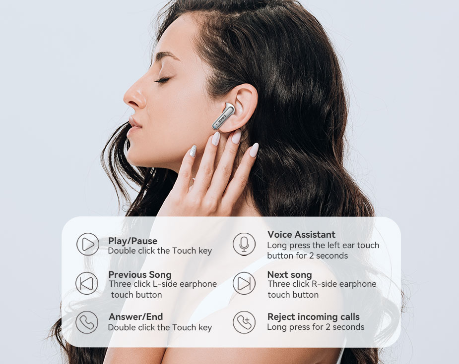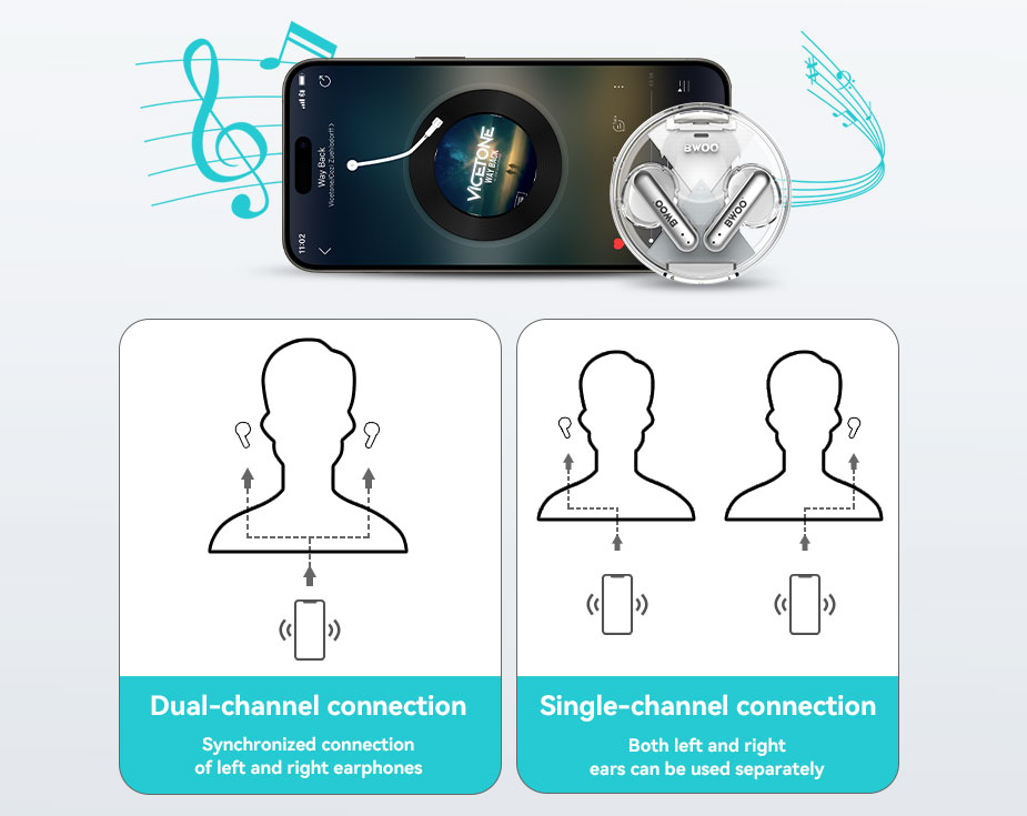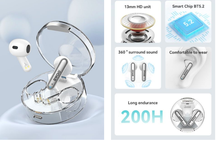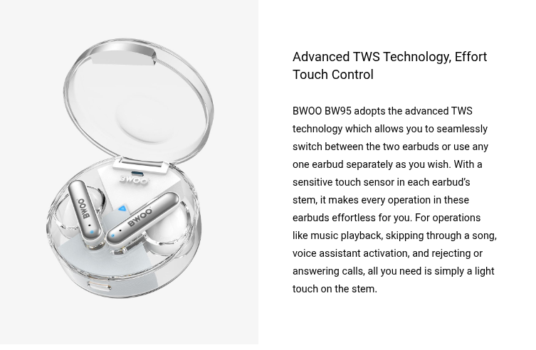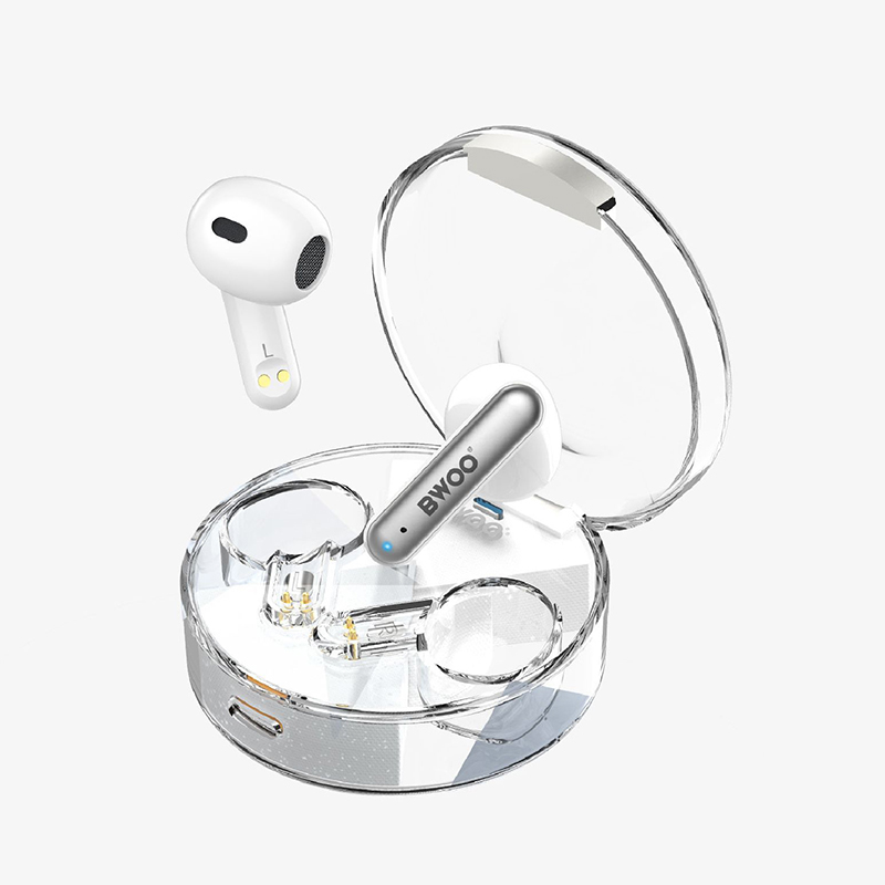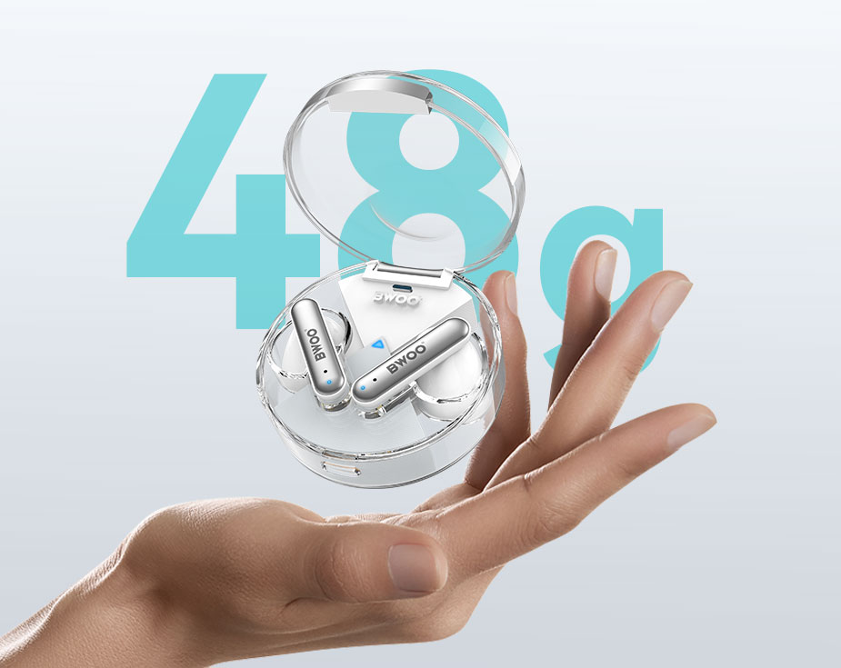 When aesthetics collide with innovation, here come our newly launched BWOO BW95 transparent earbuds. Combining white, silver with the exquisite transparent design, these earbuds naturally deliver a refreshing and cool style. Their compact dimensions, lightweight body, and ergonomic design make them almost zero pressure to wear so you will feel pain even for a long time of music. Housing highly sensitive microphones and excellent noise cancellation technology, these earbuds can effectively reduce ambient noise to promise a stunning crystal-like calling experience.