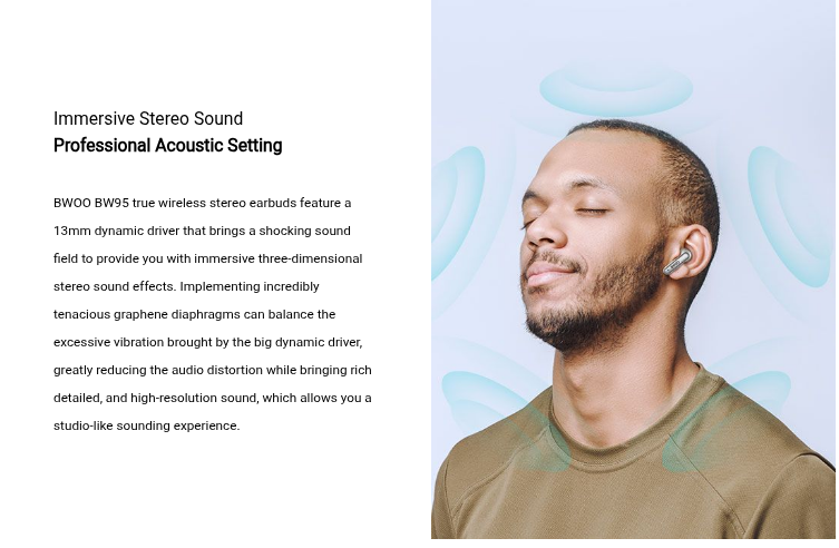 This new design earbuds utilize the latest BT5.2 version chip that performs exceedingly in wireless connection and anti-interference while running without causing high power consumption. In a radius of 10 meters, it can quickly connect with the targeted devices once the charging case is opened and keep a stable connection even in a complicated network environment. Thanks to its impressive anti-interference ability, together with the industrial leading latency lowering technology, BWOO BW95 enables zero latency, which delivers audio-to-video synchronization for a more immersive gaming experience.