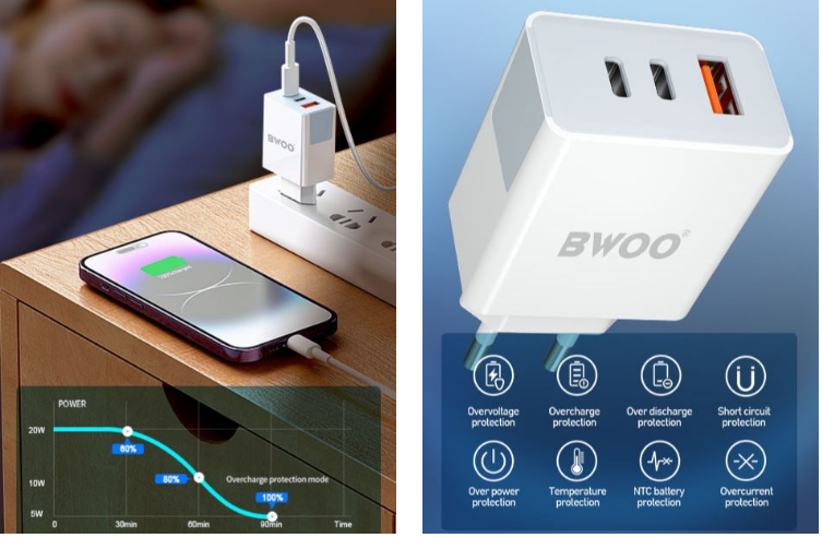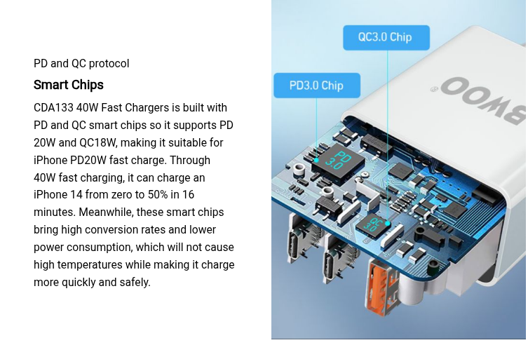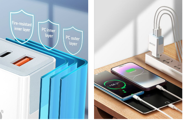CDA133 comes with an automatic overcharging protection system, meaning that it will automatically stop charging when your device has fully charged, preventing battery damage. Besides, it also has eight types of safety protection, including overvoltage protection, overdischarge protection, short circuit protection, overpower protection, NTC battery protection, and more. Also, it adopts three protective layers in its shell, among which the outer two layers are made of PC materials while the inner layer is created by high flame retardant materials that make it resist high-temperature damage, delivering a safer and more reliable user experience.