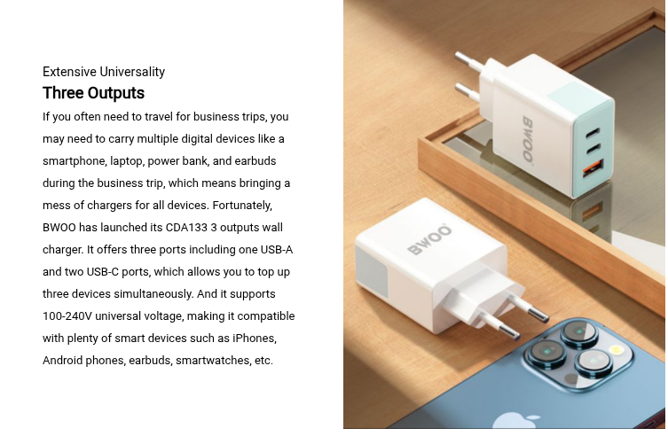 When a single port works alone, the CDA133 2 USB-C +USB-A fast cellphone charger delivers 20W of fast charge through a single USB-C while its USB-A interface offers 18W fast charge. And it can offer several quick charging modes. For example, when its three ports are charging devices at the same time, it can offer a maximum output of 38W. And when it provides power for two devices through the two USB-C ports through 40W fast charging. Besides, when a USB-A and a USB-C are running together, they can have a maximum output of 18W.