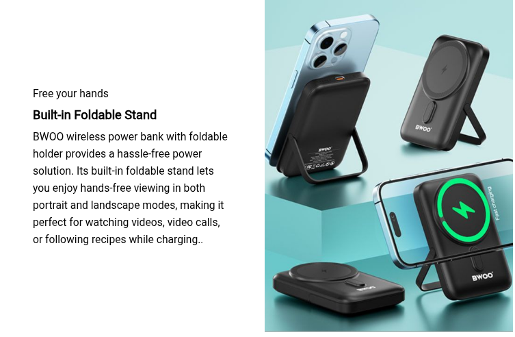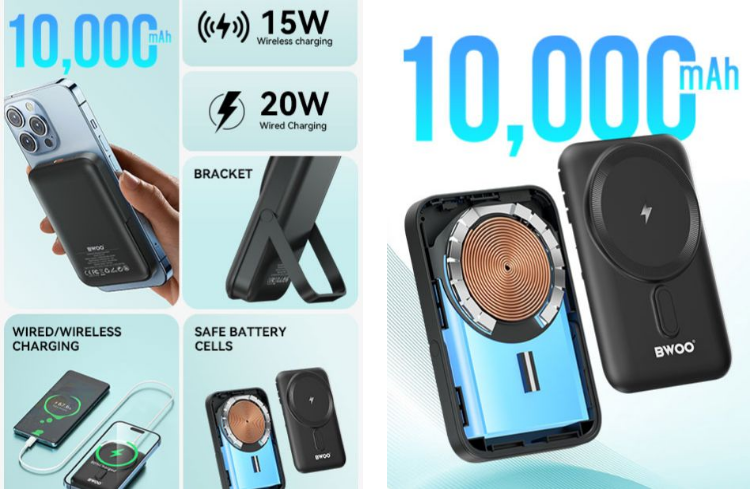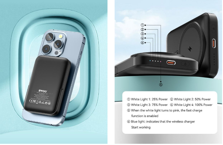 BWOO 20W fast charging power bank has a Type-C port that supports PD two-way fast charging, which means that it can pump out 20W power output for fast charge all kinds of USB-A and USB-C devices. Also, through this port, it can work with 18W power input to recharge this item quickly. With a 10000mah premium battery cell, this portable magnetic charger is small but powerful enough to support multiple times of charging for your devices, which makes sure that you can stay connected with the world.