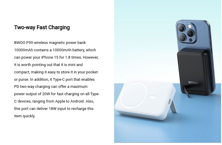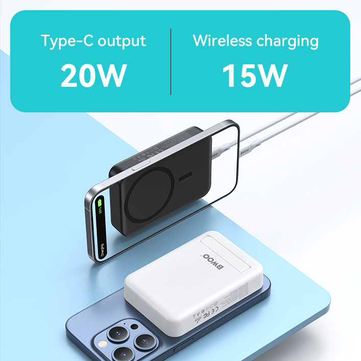 BWOO P59 mag safe power bank 10000 mAh can work with 15W magnetic wireless charging for the iPhone 12 to 13 series smartphones. It comes with strong magnets that help perfect magnetic alignment to achieve seamless, safe, and fast wireless charging. Once the device battery is low, all you need to do is simply snap it to your phone's back, and then it will start to seamlessly power your device. And the magnetic connection is powerful enough to fix your phone even when you pick it up.