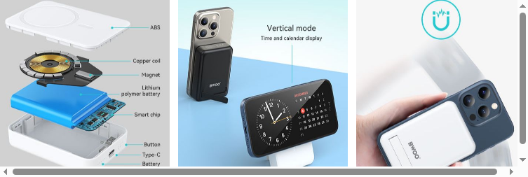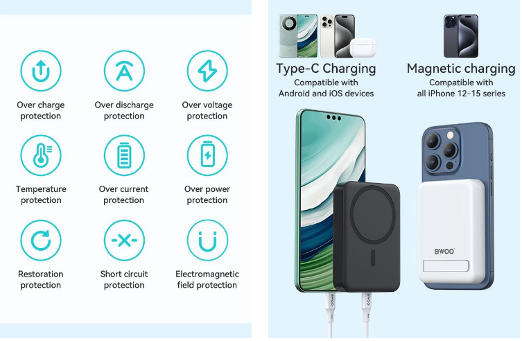 BWOO magnetic power bank with stand has a folding kickstand that allows for free adjustment so that you can charge your device vertically or horizontally, letting you continue gaming, streaming, or surfing the web on your phone with the best viewing angle. Meanwhile, when placing your phone horizontally, you use it as a desktop clock, as it will automatically show a calendar and time display.