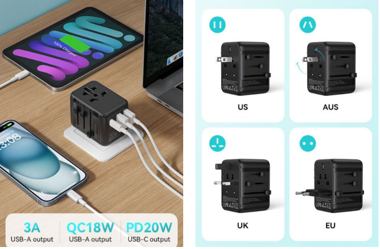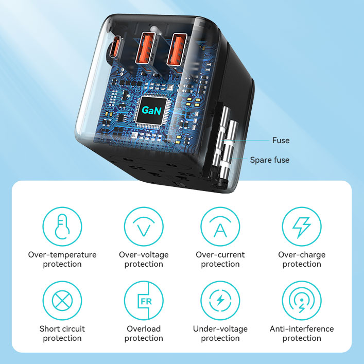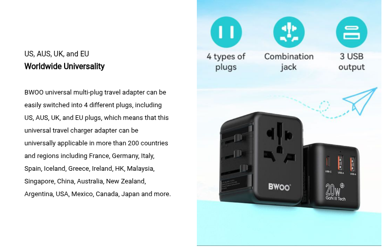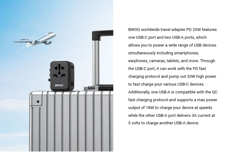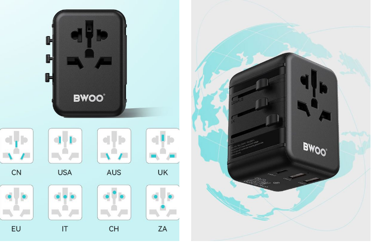 BWOO International power plug adapter adopts industry-leading GaN smart chipsets that enable this universal charger adapter to charge your devices in a more efficient and safer mode. Meanwhile, with a built-in auto-resetting fuse, this worldwide travel plug charger adapter can provide multiple safety settings including overheating protection, over-current protection, short circuit protection, overcharging protection, and more. Made from premium PC flame materials, it is certified by multiple International standards including RoHS, CE, and FCC, delivering superior safety and reliability.