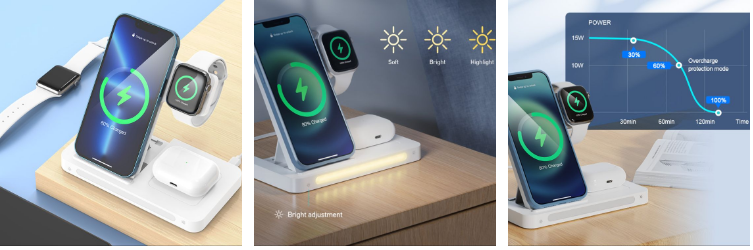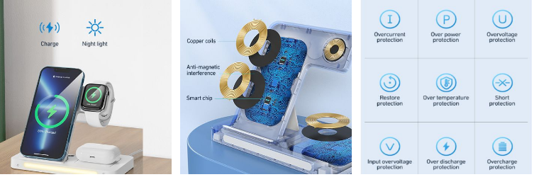 in order to make users safer to use, this 3-in-1 wireless charger adopts the most advanced chip at present, and provides multiple safety protections during charging: overcurrent protection, overpower protection, overvoltage protection, recovery protection, overtemperature protection, short circuit Protection, input overvoltage protection, overdischarge protection, overcharge protection.