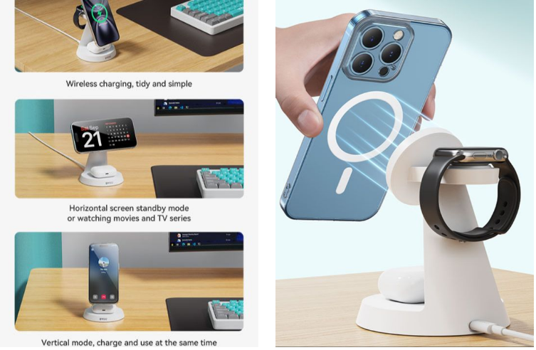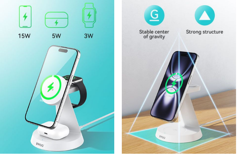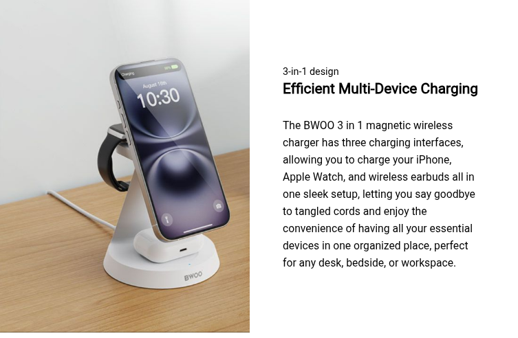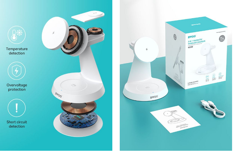 Safety and reliability are at the core of the BWOO 3-in-1 magnetic charger Station's design. BWOO, one of the most important magnetic wireless charger manufacturers, implements a built-in intelligent charging protection mechanism so this charger station keeps your devices cool and safe while charging, preventing overheating, overcharging, and