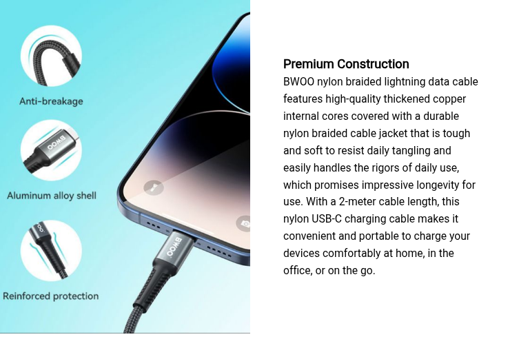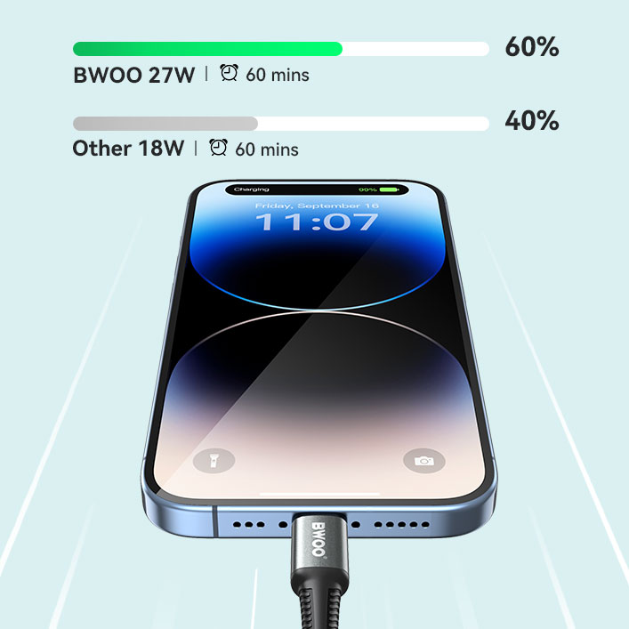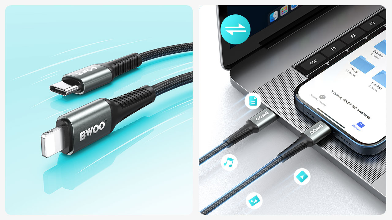 BWOO USB-C to Lightning Fast Charging Cable PD 27W is designed to deliver a rapid charging experience. With a super powerful PD 27W output, this USB-C charging cable for iPhone is suitable to top up your iPhone, iPad, airpods or other Apple devices with ultra-fast charging speed, which allows you to keep your device always ready to go, helping you stay connected and productive throughout your day. Compatible with USB 3.0, it provides a maximum data transfer rate of 480Mbps to meet your daily transfer for files, videos, and music.