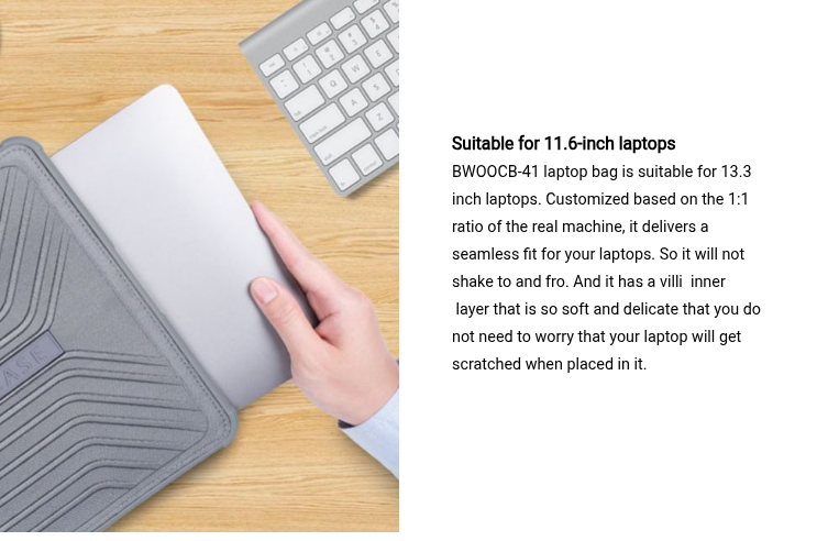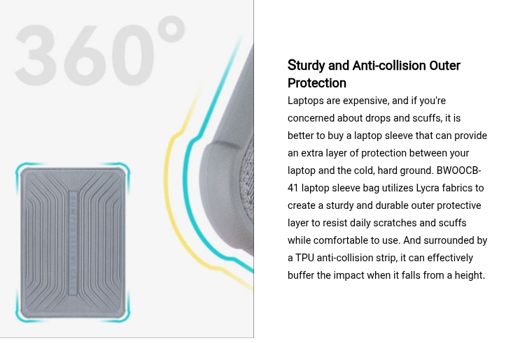 Outside TPU with Lycra protects Macbook from crash. Inside fleece provides shockproof performance. Round conners and embossed bar increase the shock absorption. Untra-thin design makes it a good choice for business travel.
