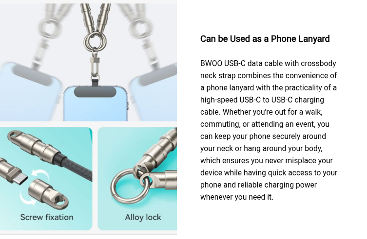 Crafted with durability and style in mind, BWOO, one of the leading charging cable manufacturer make this 2-in-1 lanyard cable roughly nylon braided to withstand everyday wear and tear. Surviving in the 10,000 bends test, this cable will not cause daily bends. With built-in fast-charging protection chipsets, these 2 in 1 phone lanyard charging cables provide your device with a more reliable and intelligent charging experience to prevent overcharging, overheating, and more. The 1.2-meter length offers flexibility for comfortable charging, whether you're holding your phone or letting it rest in your bag.