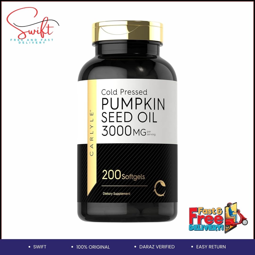 Carlyle Pumpkin Seed Oil is a dietary supplement that delivers 3,000 mg of cold-pressed pumpkin seed oil per serving in quick-release softgel capsules. This non-GMO and gluten-free formula is rich in Omega-6 and Omega-9 fatty acids, along with essential vitamins and minerals. The oil is extracted without the use of solvents, ensuring a pure and natural product. Each bottle contains 200 softgels, providing approximately 66 servings. The recommended dosage is three softgels daily, preferably with a meal. This supplement is free from artificial colors, flavors, sweeteners, preservatives, and common allergens such as wheat, yeast, milk, lactose, and soy. Pumpkin seed oil has been traditionally used to support prostate and urinary health, and its rich nutrient profile may also promote healthy skin and overall wellness.