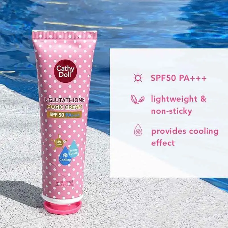 - Key benefits:• Skin whitening• Waterproof• Skin moisturizing• Pore tightening• Ultra-high SPF 50 PA++ protection• Sun protectionHow to use:Squeeze a smallamount of L-GlutathioneMagic Cream onto your palmApply to yourface andbody and gently blend in using a gentle circular motion The cream thenwill employ the power of Cool Water Splash Technology to penetrate your skinfor in-depth protection and nourishment For more bestresults benefit, should apply e...