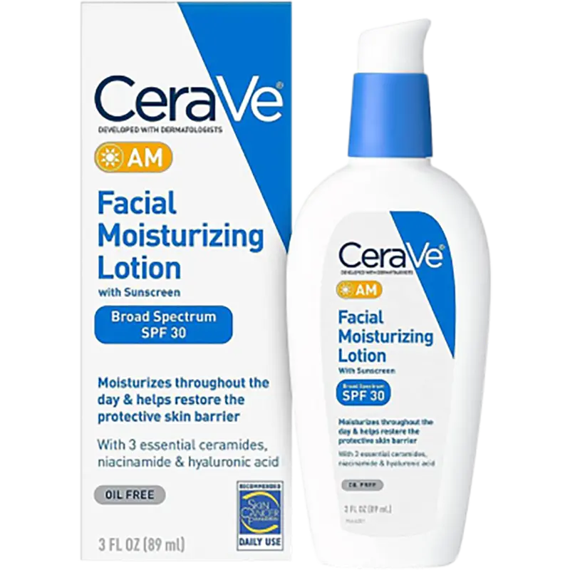 Developed with dermatologists, CeraVe AM Facial Moisturizing Lotion with Sunscreen moisturizes throughout the day and helps to restore the protective skin barrier. This sunscreen lotion is Formulated with broad spectrum SPF 30 sunscreen for daily UV protection, protecting your skin from damaging UVA and UVB rays. This non-comedogenic moisturizer with SPF 30 spreads easily without leaving a chalky residue.