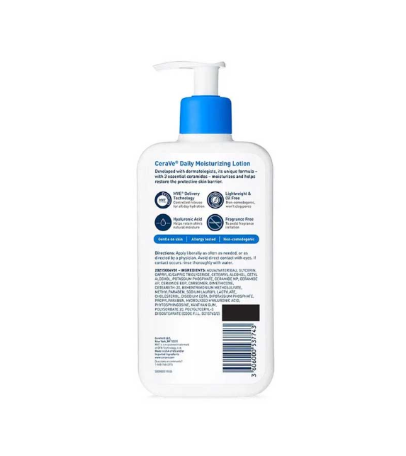 CeraVe Daily Moisturizing Lotion is a lightweight, non-greasy moisturizer designed to provide long-lasting hydration for normal to dry skin. Formulated with 3 essential ceramides and hyaluronic acid, it helps restore and maintain your skin’s natural protective barrier while keeping it soft and smooth all day. Developed with dermatologists, this lotion absorbs quickly and is fragrance-free, oil-free, and non-comedogenic, making it suitable for both face and body, and gentle enough for sensitive skin.