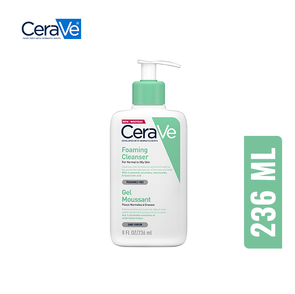 CeraVe Foaming Cleanser is a gentle face wash specially designed for normal to oily and acne-prone skin. Formulated with 3 essential ceramides, niacinamide, and hyaluronic acid, it cleanses dirt, excess oil, and makeup without disrupting the skin’s natural protective barrier. This fragrance-free cleanser provides a refreshing foaming action that leaves your skin soft, calm, and hydrated.