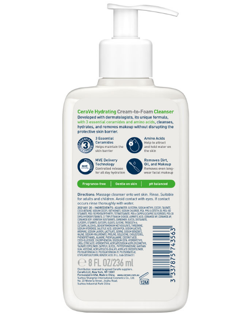 - Amino acid-based surfactant: This mild cleansing ingredient transforms the cream face wash into a delicate foam that gently yet effectively removes dirt, oil and makeup