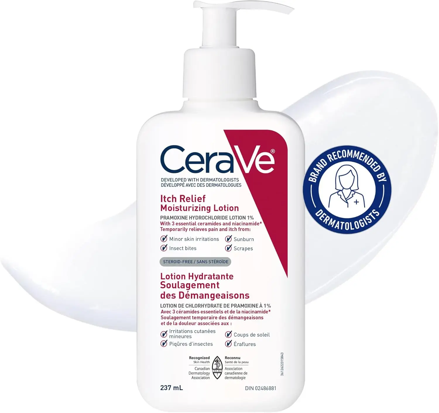 CeraVe Itch Relief Moisturizing Lotion is a dermatologist-developed, fast-acting formula that provides temporary relief from itching and irritation caused by minor skin irritations, insect bites, sunburn, or scrapes. Infused with 1% Pramoxine Hydrochloride, 3 essential ceramides, and niacinamide, this lotion soothes discomfort while restoring the skin’s natural barrier. Its lightweight, non-greasy texture keeps skin calm, hydrated, and comfortable without the use of steroids