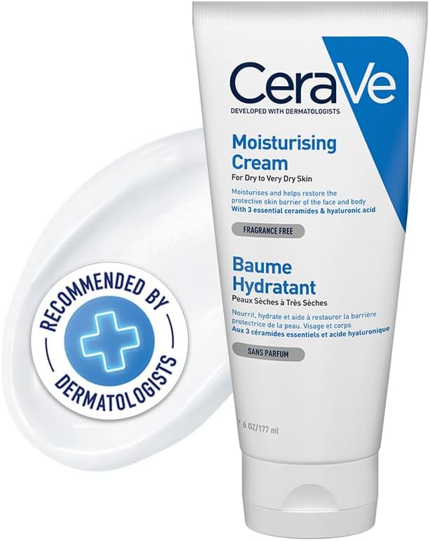 CeraVe Moisturising Cream is a dermatologist-developed, rich, non-greasy cream designed to provide long-lasting hydration for dry to very dry skin. Formulated with 3 essential ceramides and hyaluronic acid, it helps restore and protect the skin’s natural barrier while locking in moisture. Fragrance-free and gentle, it is suitable for use on the face, body, and even hands.