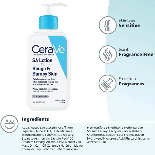 CeraVe SA Lotion for Rough & Bumpy Skin is a lightweight, non-greasy moisturizer designed to gently exfoliate while deeply hydrating. Formulated with salicylic acid and lactic acid, it helps smooth rough, uneven skin texture, while three essential ceramides restore the skin’s natural barrier. Niacinamide soothes irritation, and hyaluronic acid delivers lasting hydration. Perfect for sensitive, dry, and bumpy skin, this fragrance-free lotion leaves skin softer, smoother, and healthier-looking.