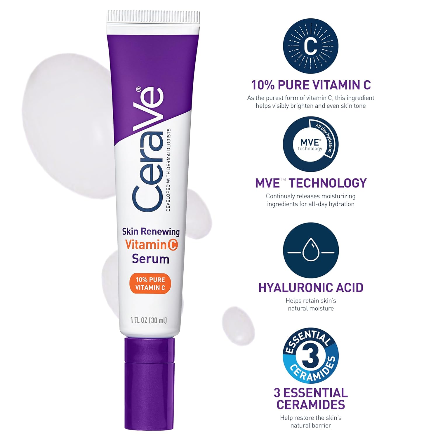 CeraVe Skin Renewing Vitamin C Serum is a lightweight formula enriched with 10% pure Vitamin C (L-ascorbic acid) to visibly brighten skin, even out tone, and provide antioxidant protection. With 3 essential ceramides and hyaluronic acid, this serum helps restore the skin’s natural barrier while locking in lasting hydration.