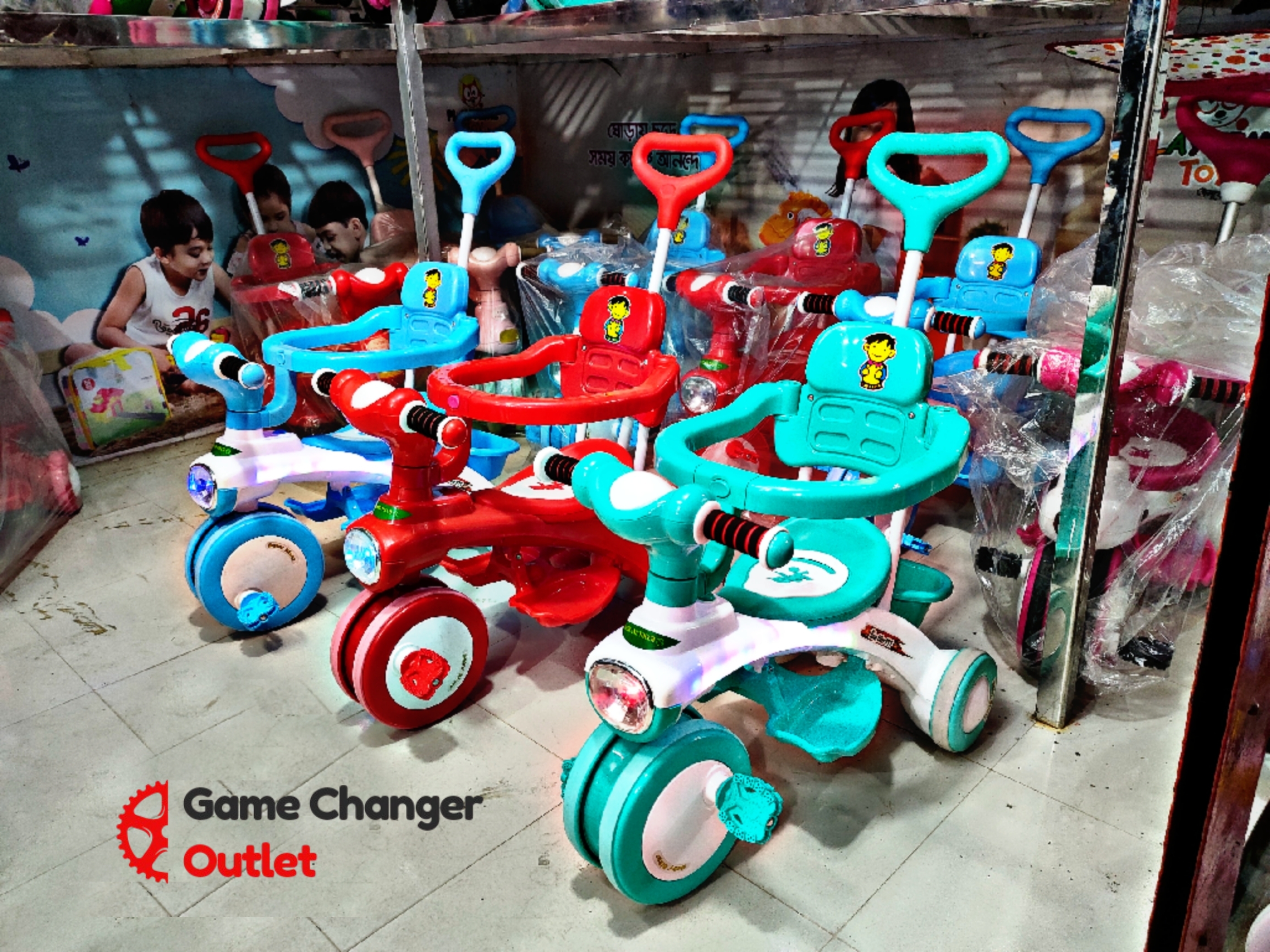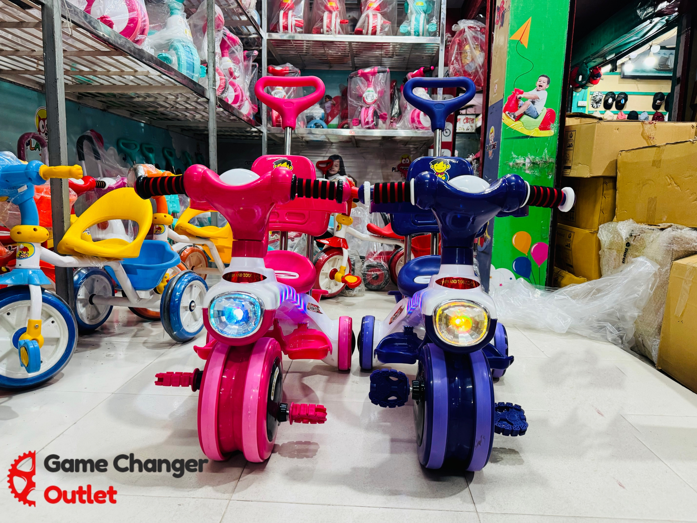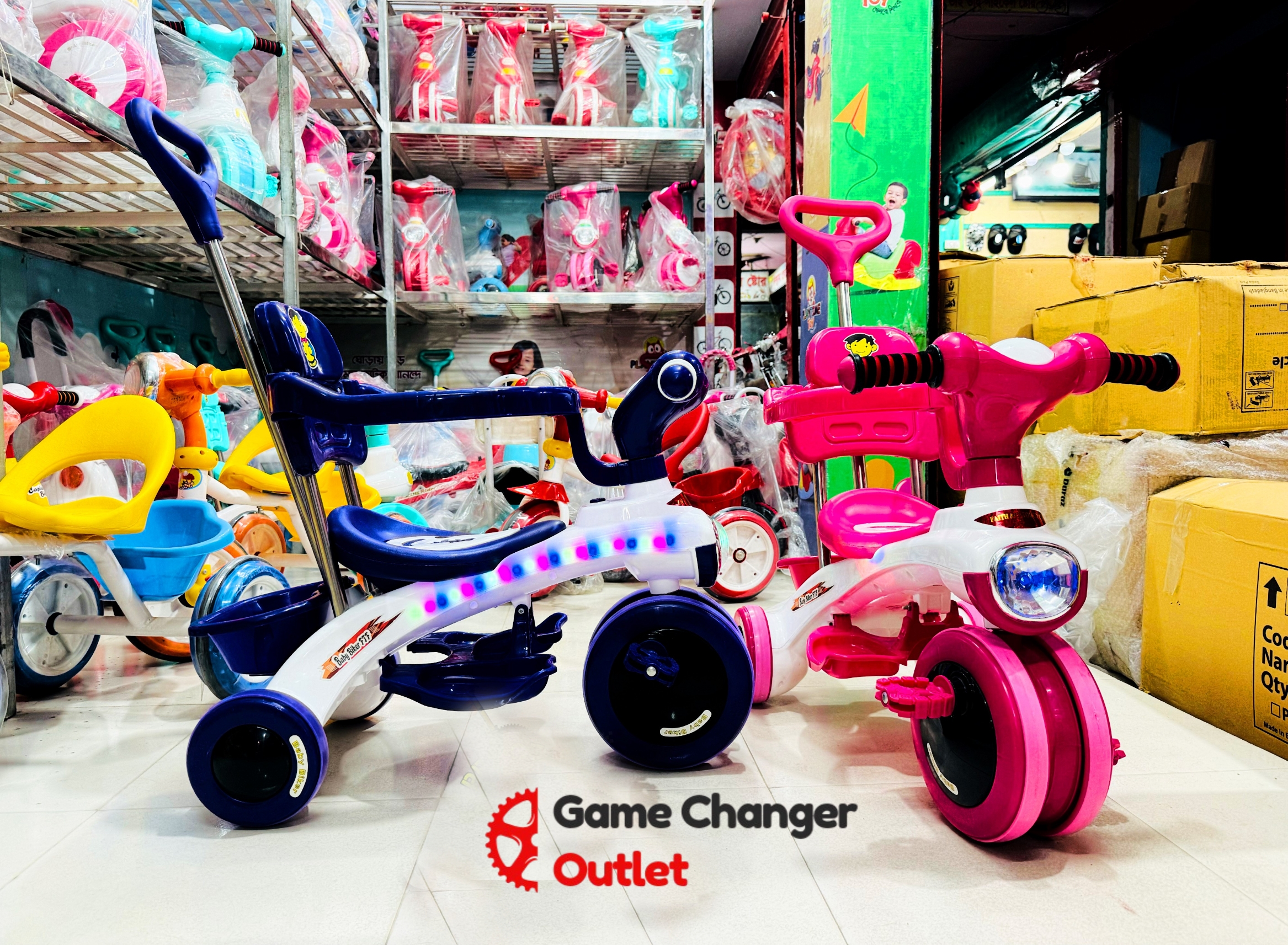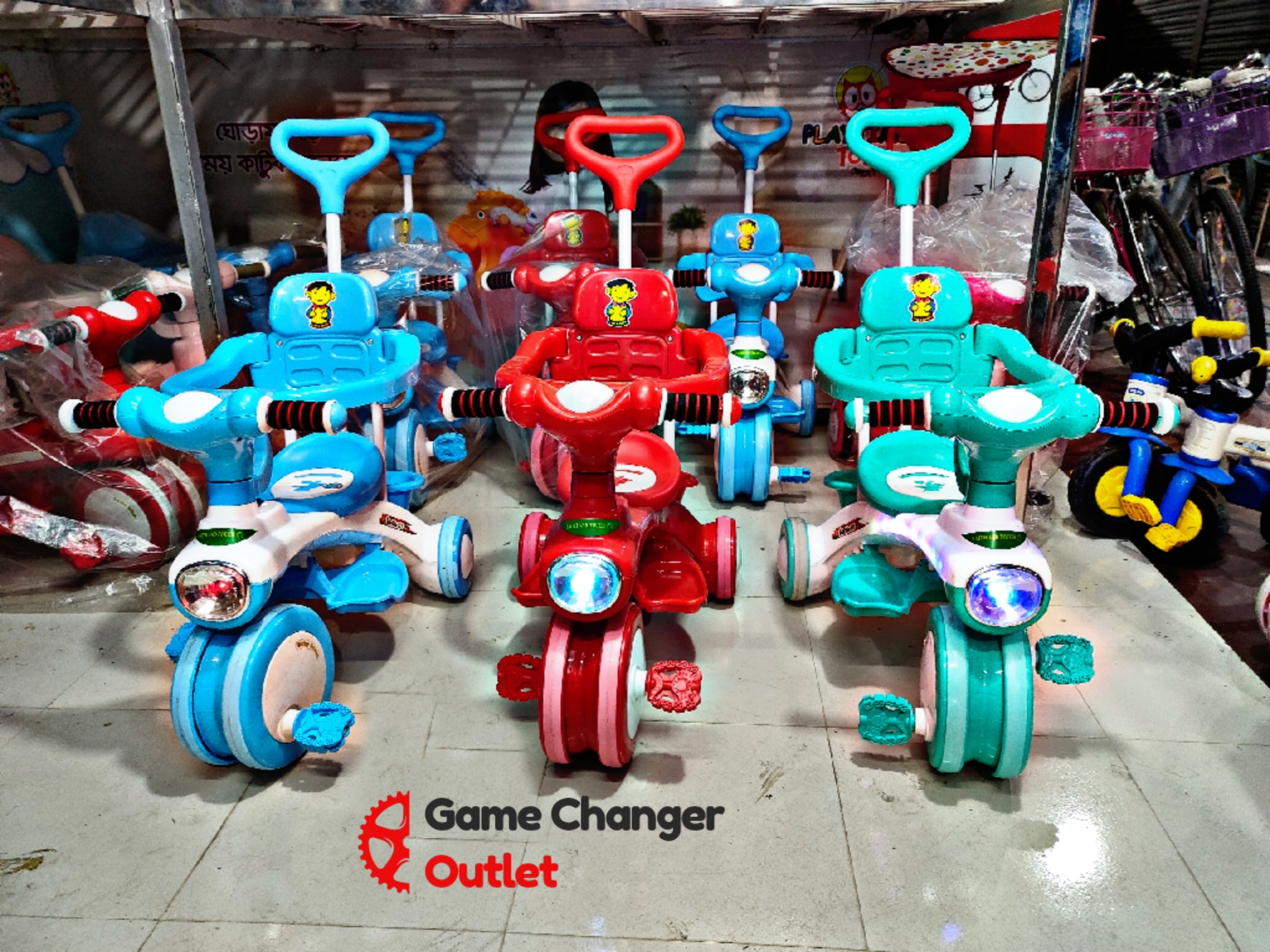 Brand : China Import Product Type: Tricycle Dimension (LxWxH)CM:67x41x48.5 Age capacity: 9 months-5 years Comfortable fence, seat, and backrest Push handle to move the tricycle Foot support for kids Softer handle grip Music & Lighting system with volume up-down High durability soft ride wheels Large capacity basket Color: Pink Pink/Blue/Red/Purple (As given picture).