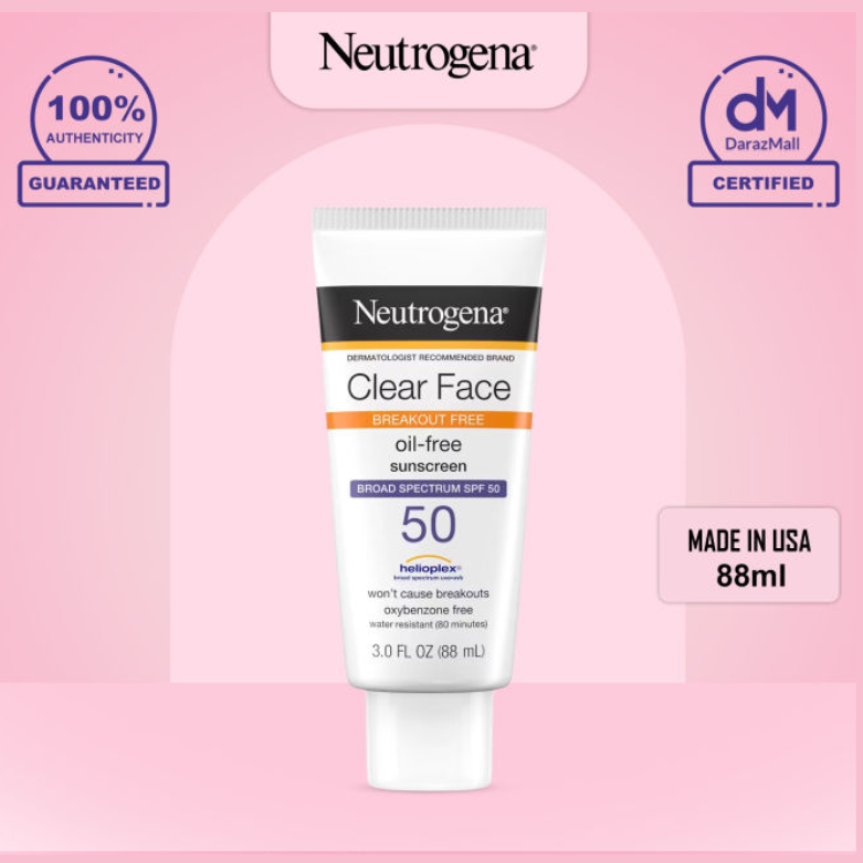 Neutrogena Clear Face Sunscreen SPF 50 is a lightweight, oil-free, and non-comedogenic sunscreen designed specifically for acne-prone and sensitive skin. Formulated with Helioplex® technology, it offers superior broad-spectrum protection against UVA and UVB rays. The water-light texture ensures a breathable, matte finish without clogging pores, making it suitable for daily use. It's also water-resistant for up to 80 minutes and free from oxybenzone and fragrance.