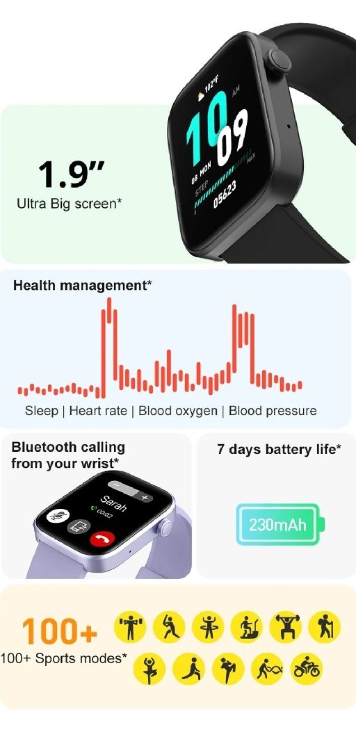 Activity Record(Steps, calories, distance), Sport Goal, 100+ Exercise Modes, Sports Data Report, IP68 waterproof.