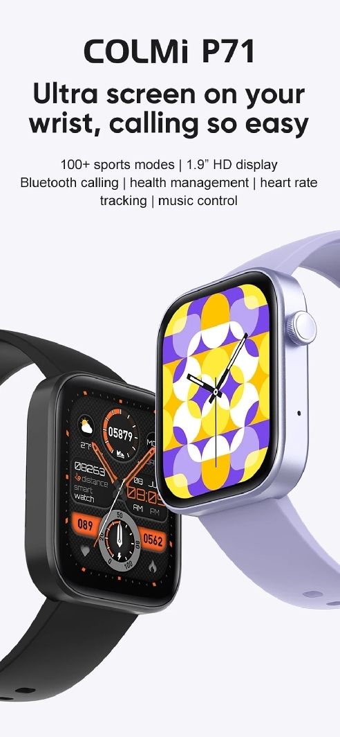 Super large screen: COLMi P71 uses a 1.9-inch screen with images, wide field of vision, vivid content and more conve use. Super chip: COLMI P71 uses RTL8763EWE as the main chip, which has higher performance, stronger and faster, and runs naturally and smoothly. Ultra-multifunctional: COLMI P71 has a variety of functions, including calling, exercising, measuring heart rate and blood oxygen, games, calculators, etc.Super large screen: COLMI P71 uses a 1.9-inch screen with clear images, wide field of vision, vivid content and more convenient use.