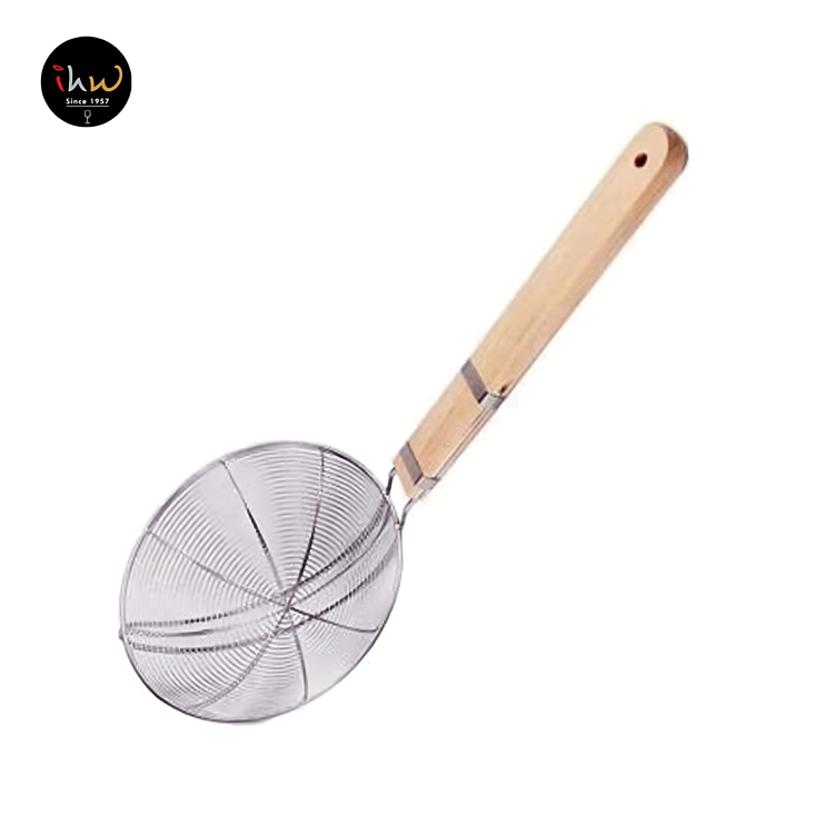 The IHW Commercial Stainless Steel Strainer with Wooden Handle is designed for heavy-duty use in professional kitchens. Its durable stainless steel body ensures long-lasting performance, while the ergonomic wooden handle provides comfort and safety during use.
